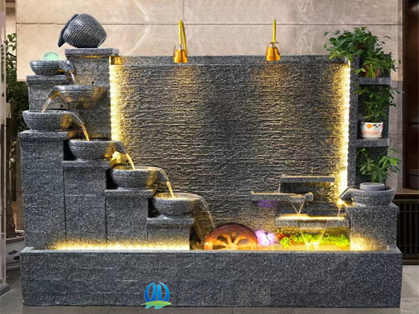 现实生活中的数字水幕、水幕墙、水帘、喷泉、假山、瀑布等水景观在现代景观水景中的作用及风水表现,风水是汉民族历史悠久的一门文化,较为科学性的说法为堪舆。黑色的大理石和层层跌水游来游去的锦鲤以及卖力的喷泉···